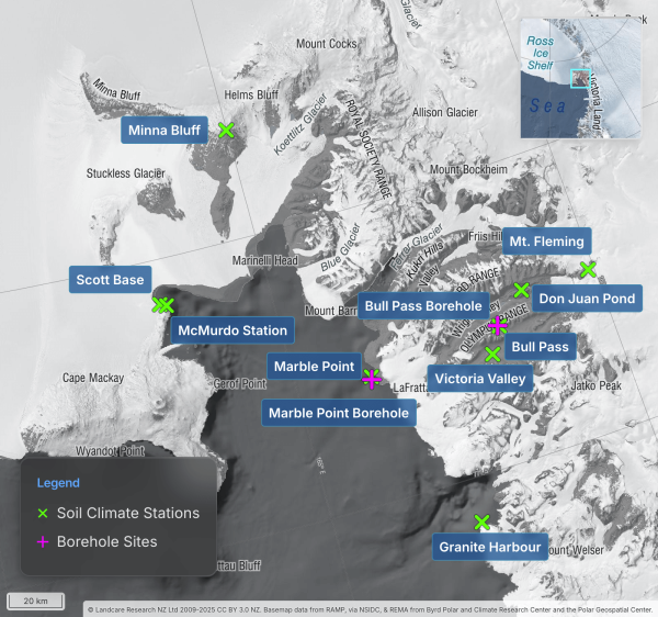 Manaaki Whenua Landcare Research, the University of Waikato, and the United States Department of Agriculture established a network of soil-climate monitoring stations in the McMurdo Sound region, Antarctica with the support of Antarctica New Zealand. Started in 1999, it is the largest long-running continuous soil-permafrost temperature monitoring data set for the seventh continent. This page provides some background to the stations, and links for data access.